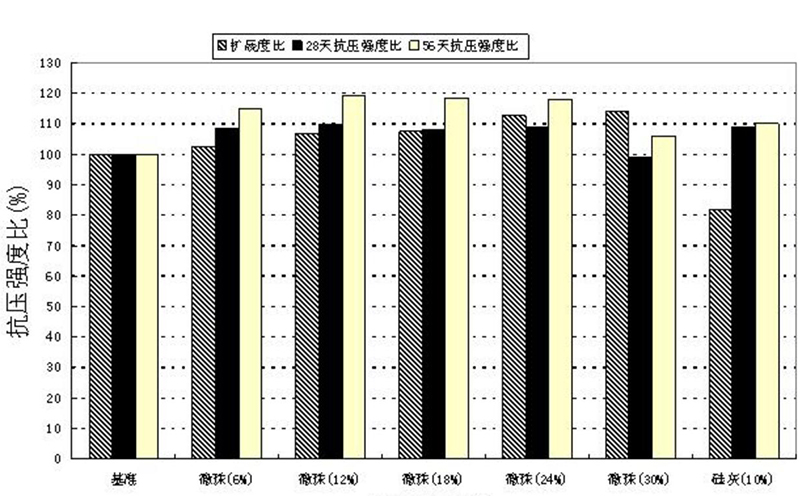 混凝土抗?jié)B性效果明顯。抗凍和抗融冰鹽性能用CDF法作試驗56次凍融循環(huán)結果,優(yōu)于水泥,更明顯優(yōu)于普通粉煤灰和硅灰(加硅灰的混凝土抗凍性不好)?!俺毞邸蓖耆梢匀〈杌矣糜谂渲聘咝阅芑炷?。根據(jù)實驗,用42.5級水泥作水泥砂漿進行性能對比實驗,在相同水/膠比情況下用“超細粉” 等量替代水泥,“超細粉”摻入量分別為6%、12%、18%、24%和30%,硅灰摻量為10%。其擴展度和28天、56天強度比見。